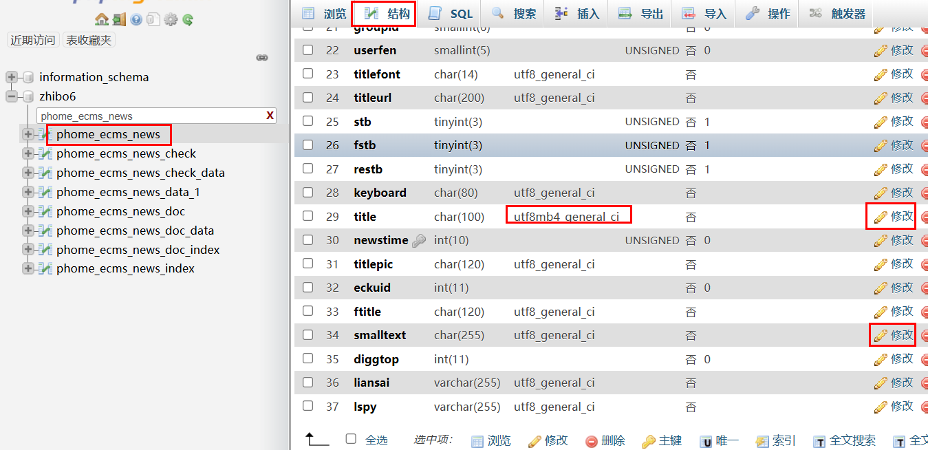 1,打开phome_ecms_news,点击结构,修改title(标题)和smalltext(内容简介)两个字段