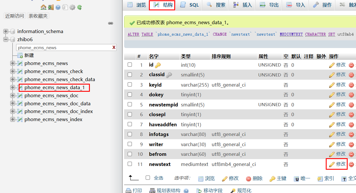 2,打开phome_ecms_news_data_1,点击结构,修改newstext(文章内容)字段