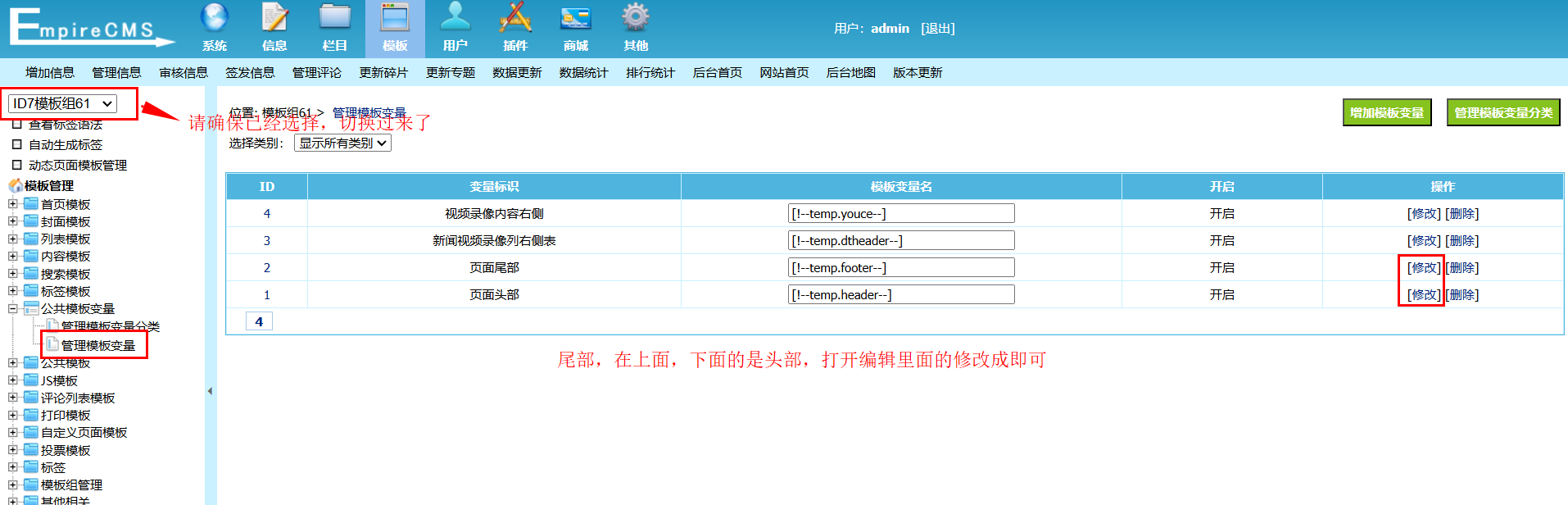 2,选择好所在模板组,点击管理模板公共变量,找到头部或者尾部修改即可!