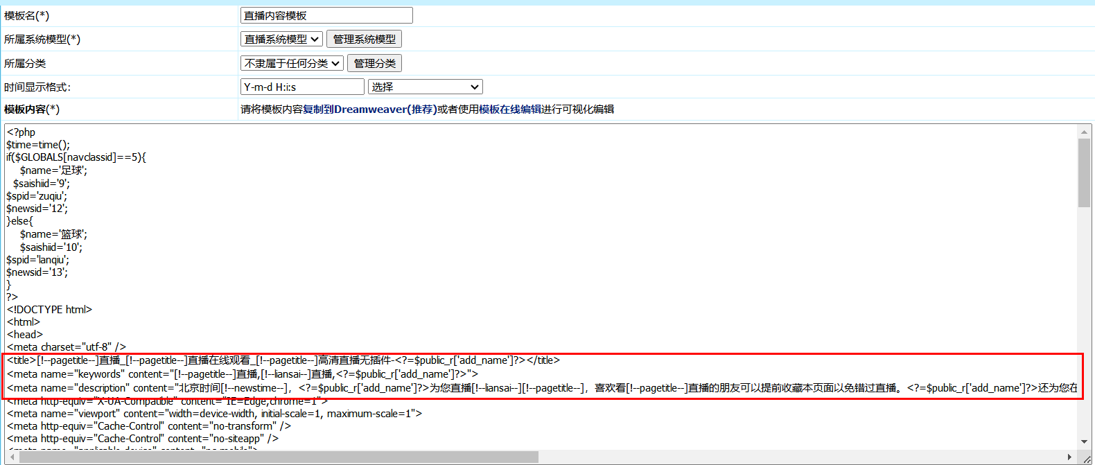 3、直播页面TDK设置 登录网站后台,进入界面: 模板 》内容模板 》管理内容模板 》直播内容模板