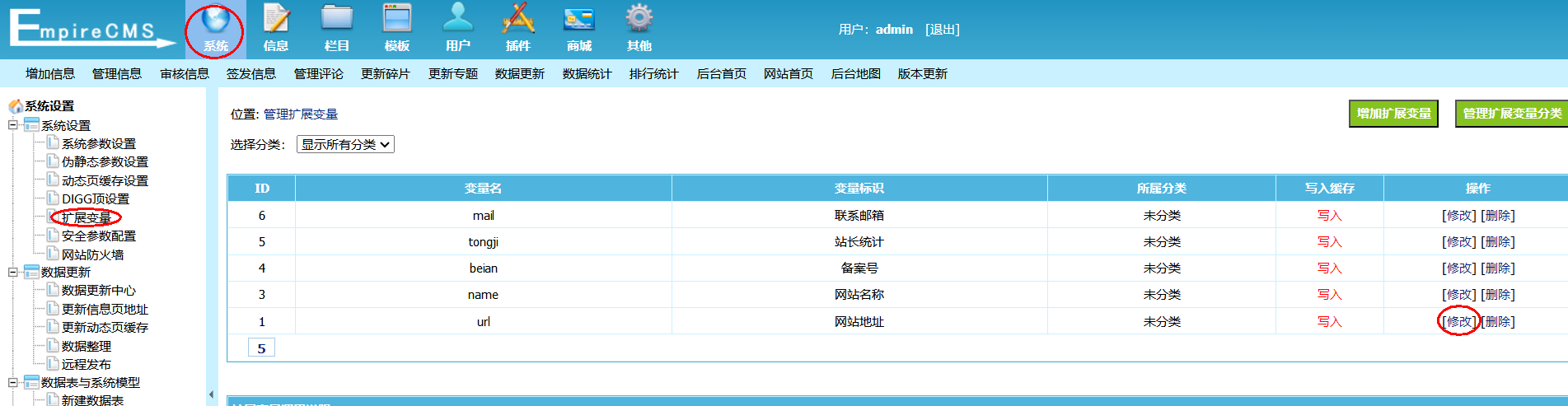 2、网站名称以及统计添加 登录网站后台,进入界面: 系统 》系统参数设置 》扩展变量